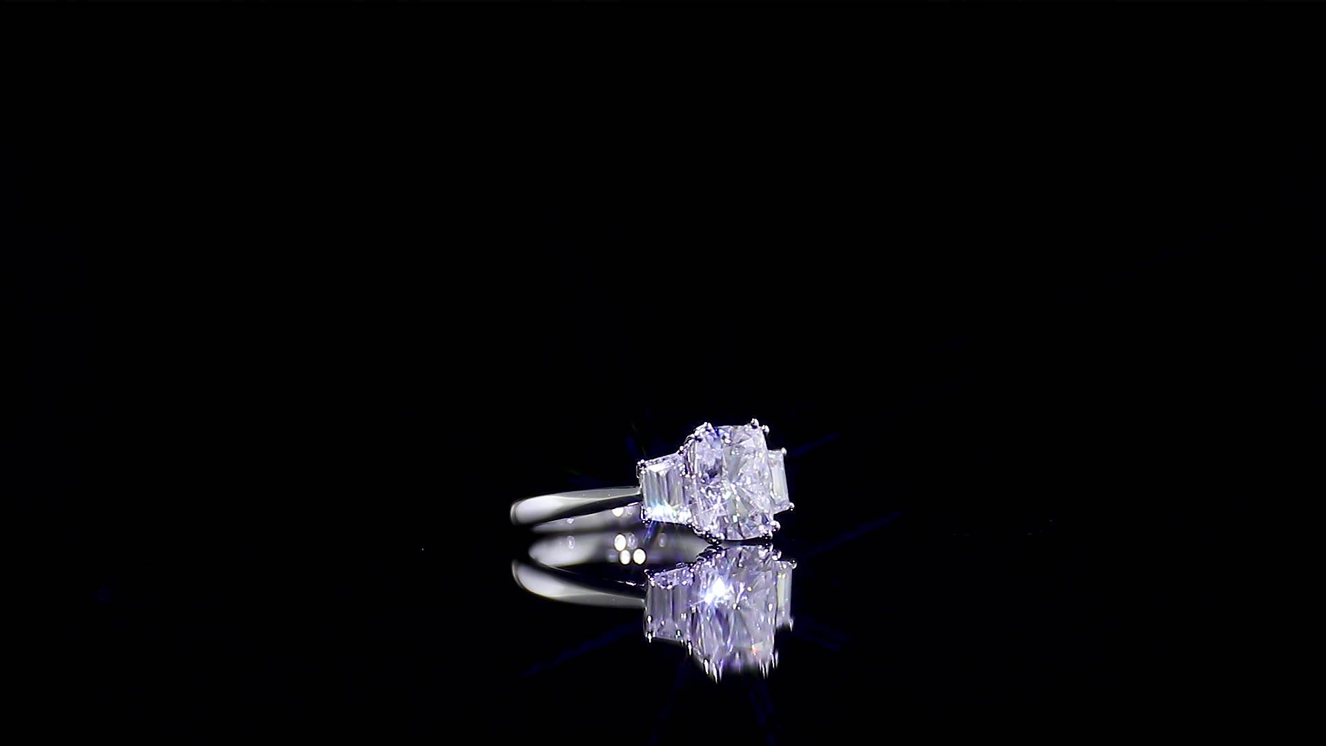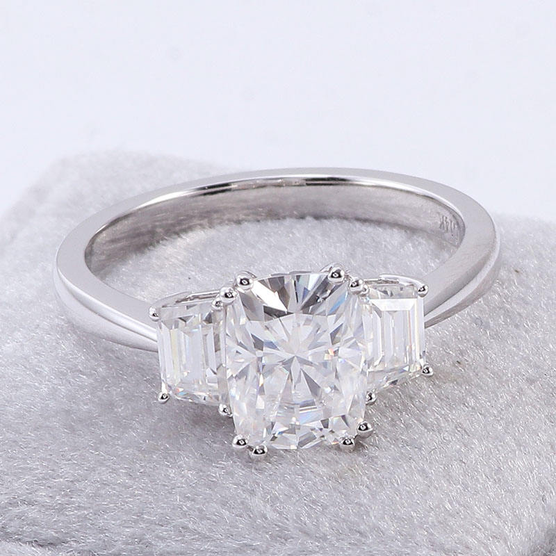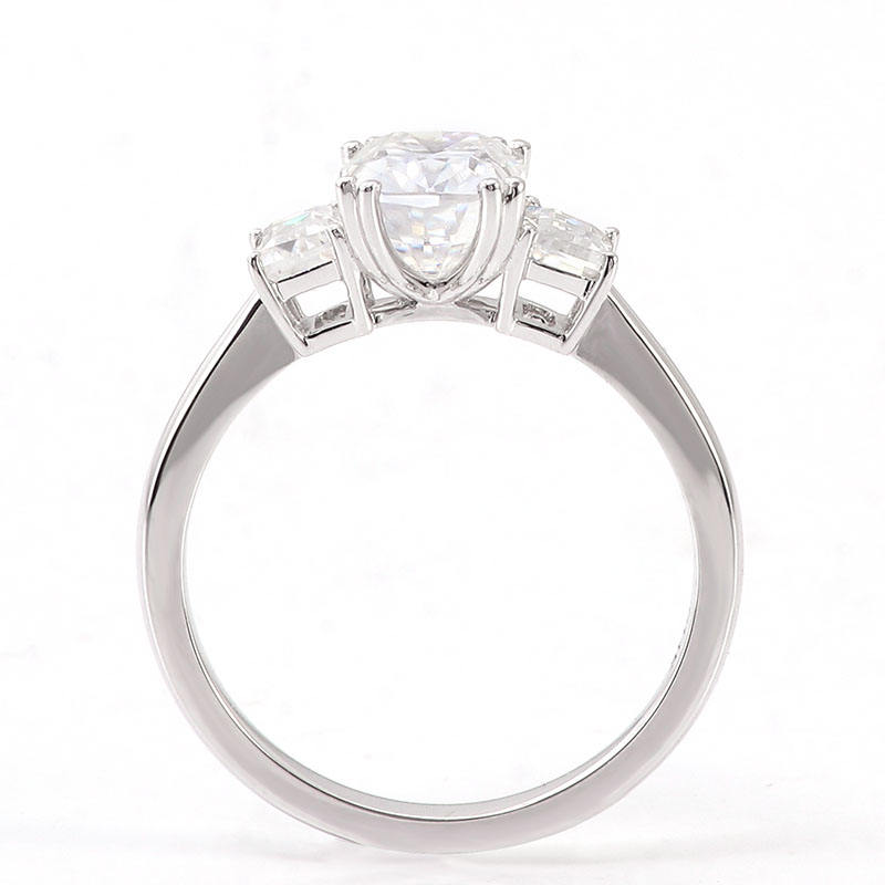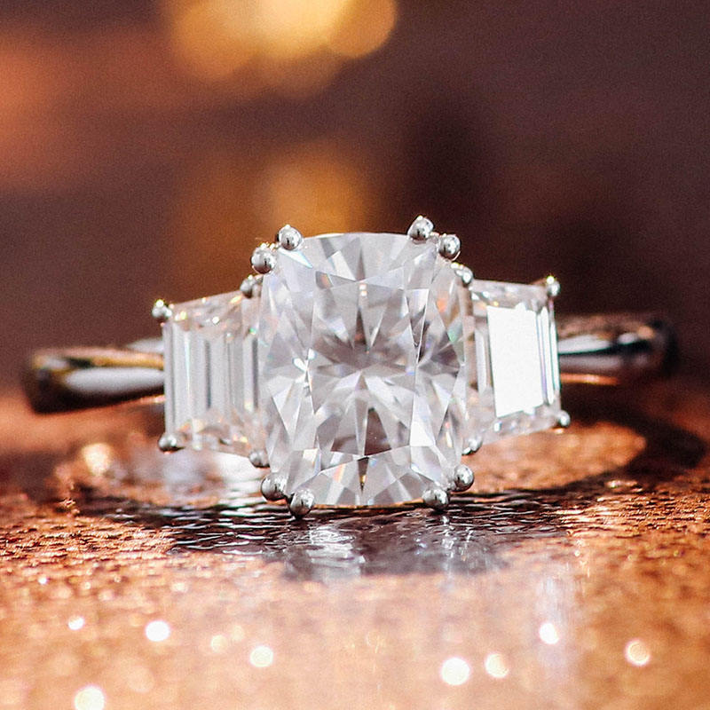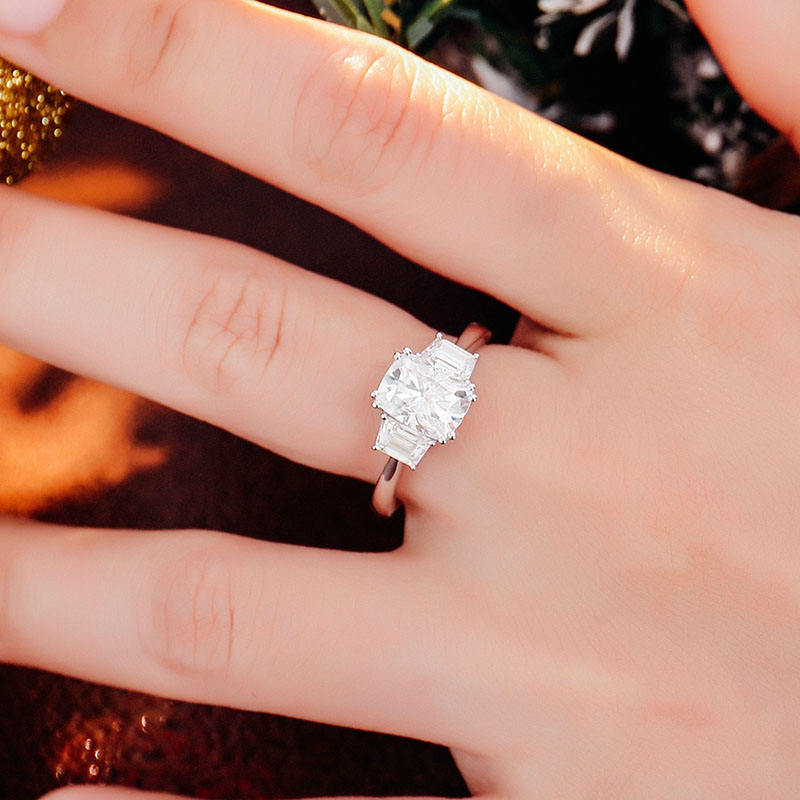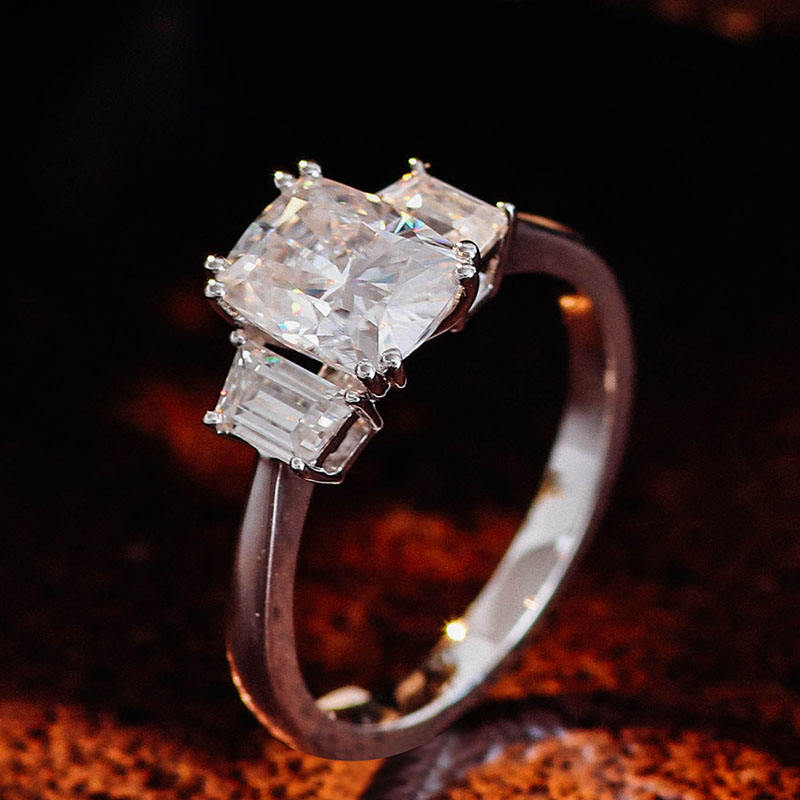 Timeless elegance meets modern craftsmanship in this stunning three-stone lab-grown diamond engagement ring. Featuring a brilliant cushion-cut center stone, this ring is beautifully accented by two emerald-cut side diamonds, creating a sophisticated and balanced look.